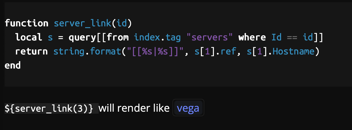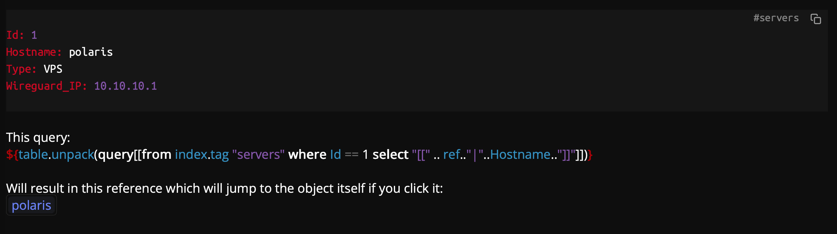 ${table.unpack(query[[from index.tag "servers" where Id == 1 select "[[" .. ref.."|"..Hostname.."]]"]])}