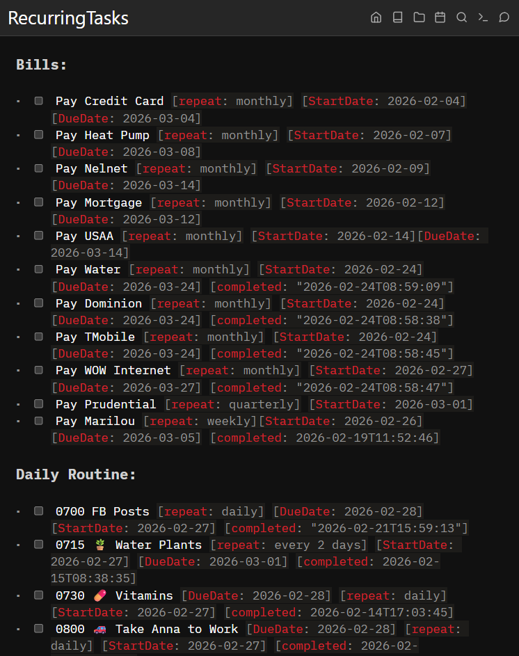 - [ ] Water plants [repeat: every 3 days][StartDate: 2026-02-14]