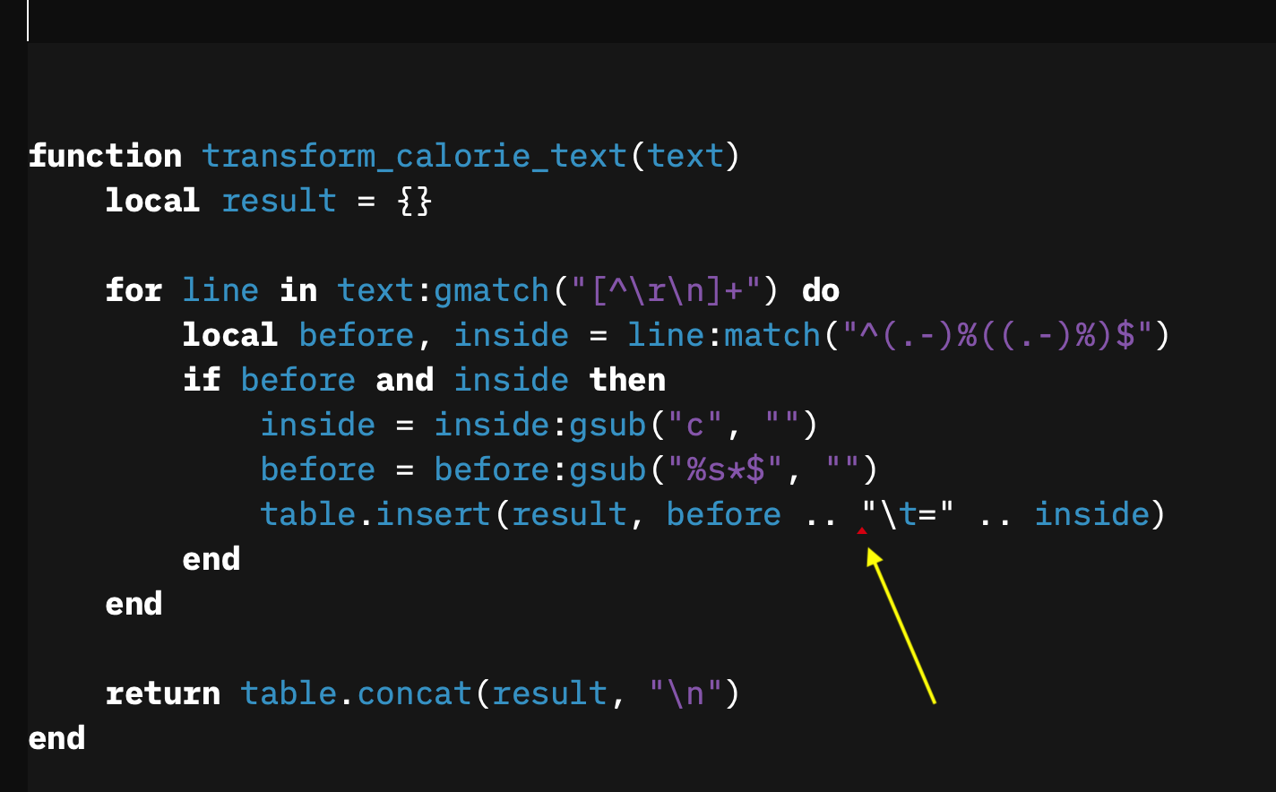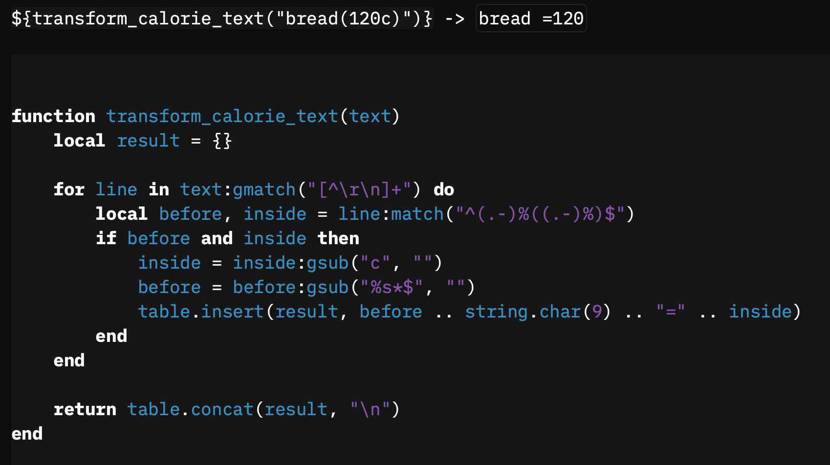 I added the following function within a page, and tried to call it with ${transform_calorie_text(...)}, which didn’t really work (function is still nil). Am I supposed to do something more to make the function available? Do I have to declare this somewhere else?