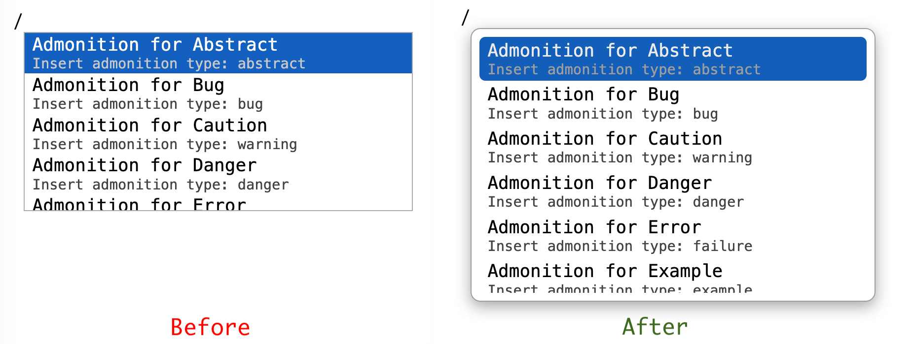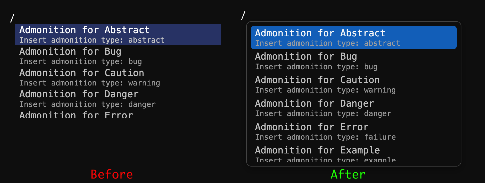 I’ve prepared this minor refinement which introduces some much-needed visual breathing room (padding & increased height) and more importantly, adds also mouse hover (subtle ghost color) in addition to the keyboard selection (primary color).