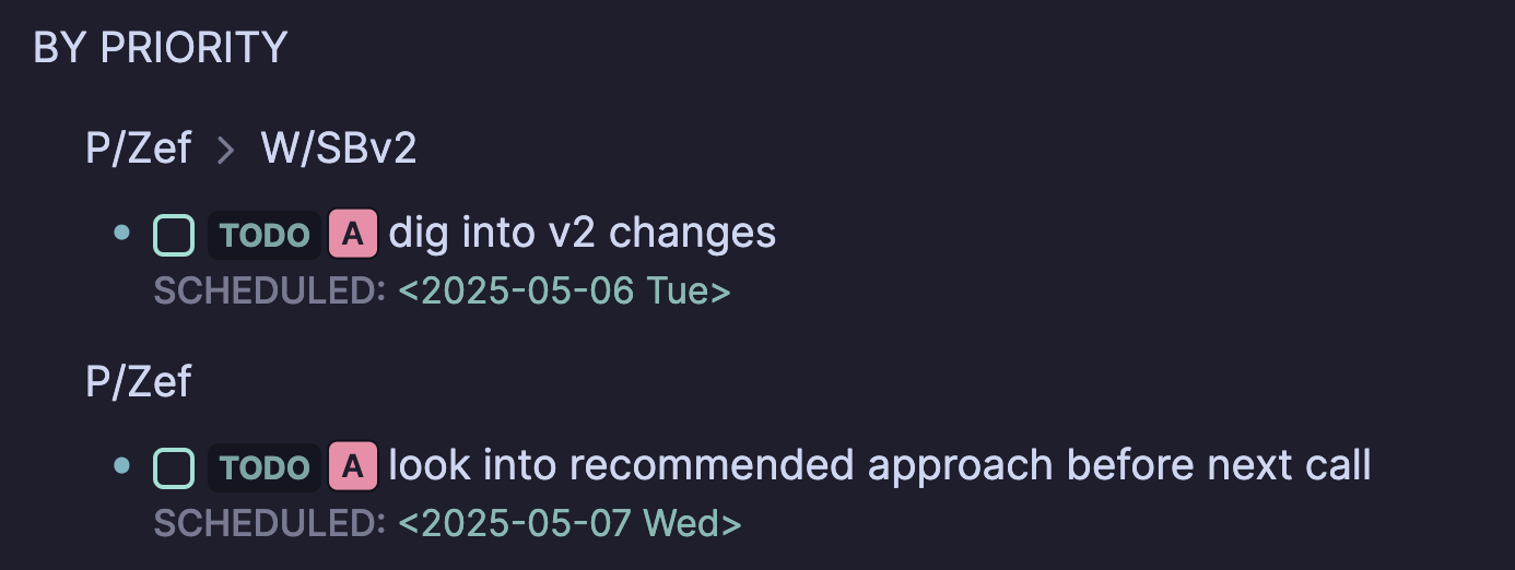 Here’s a more practical example page in today’s journal in Logseq, which would live in journals/2025_05_04.md. Let’s say I had 1 meeting that day with @zef where we talked about the V2 project and some other random topics.
