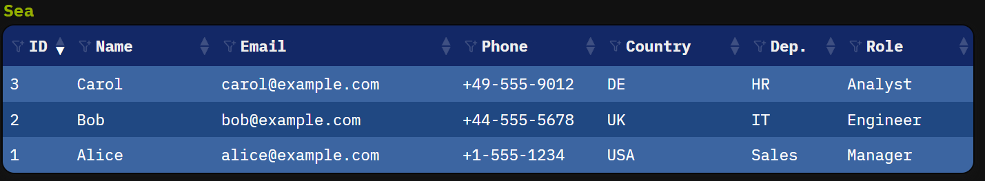 | ID #sea #t80p #c5p| Name #c10p| Email #c20p | Phone #c10p| Country #c5p| Dep. #c5p| Role |