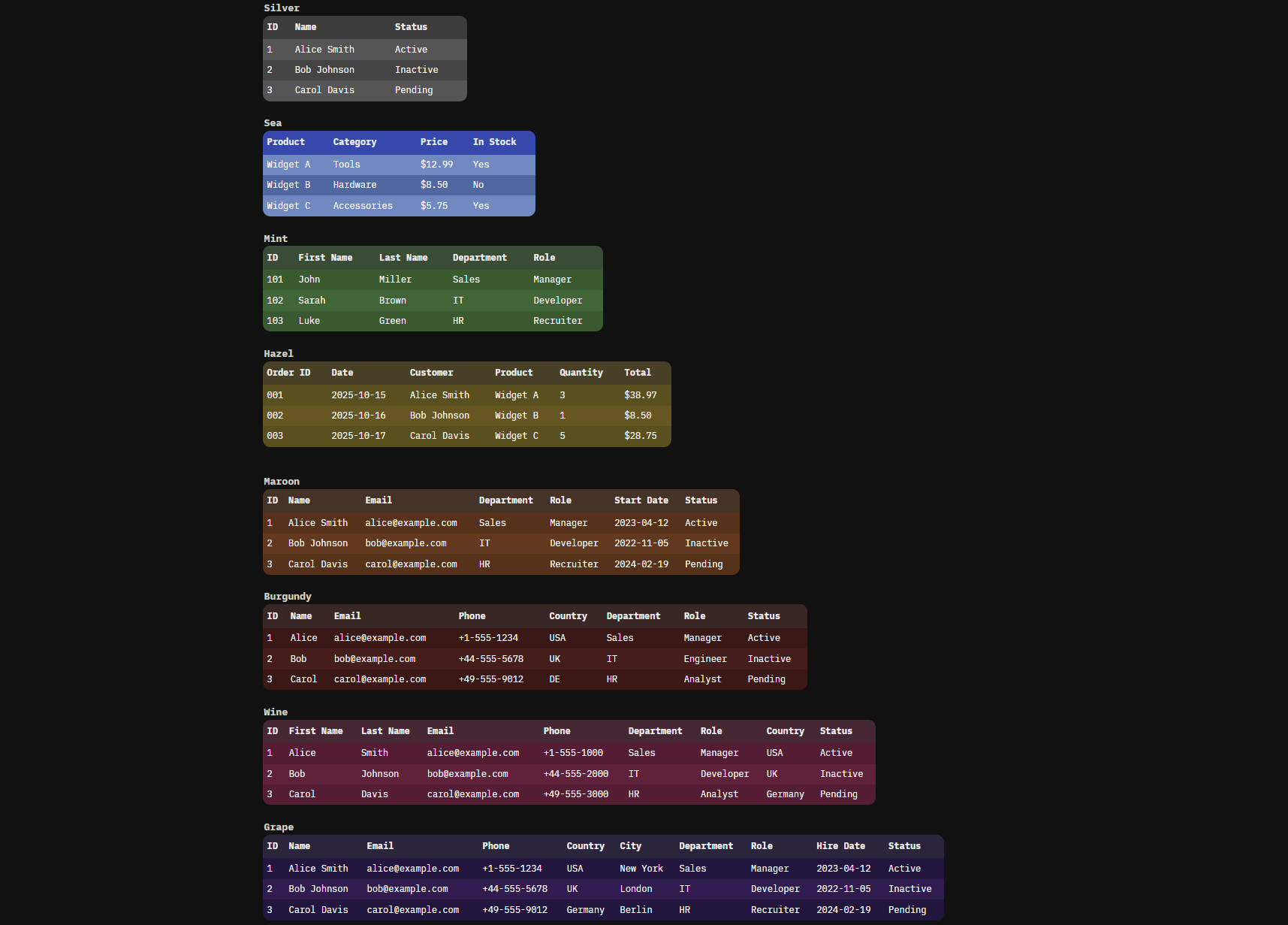 | 3 | Carol | [email protected] | +49-555-9012 | DE | HR | Analyst |
