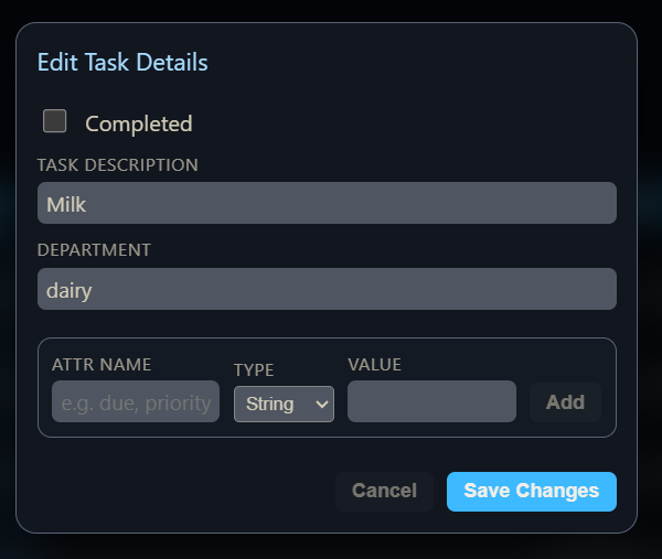 My ultimate goal is to be able to have a "shopping list" where I can write queries to pull all the unchecked items for each department. My issue is that I would want to be able to edit the attributes and have them sync much like the task state does. Has anybody done something similar, because I'm not having any luck doing it in a regular query.