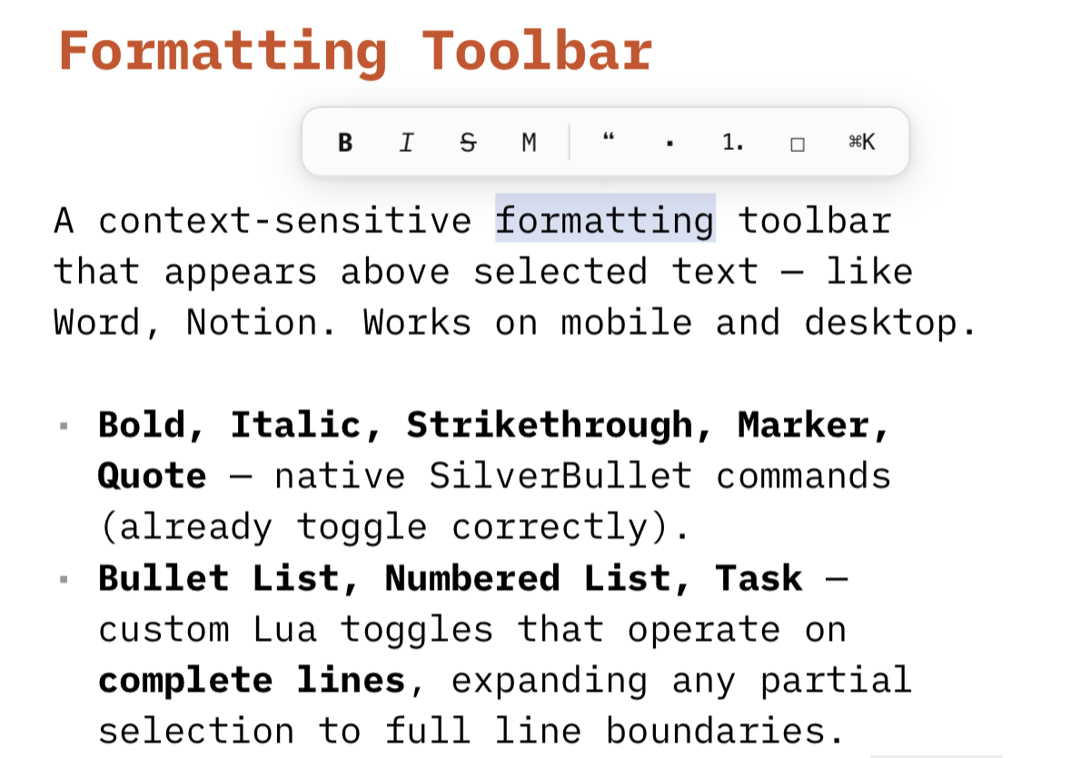 I was missing an easy way to format certain selected text using the mouse, and also because I can’t always remember all the shortcut keys in Silverbullets I created thus Formating Toolbar for basic text formatting, which appears everytime you select text.