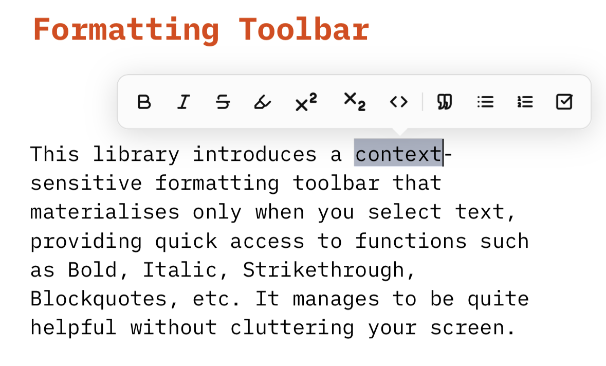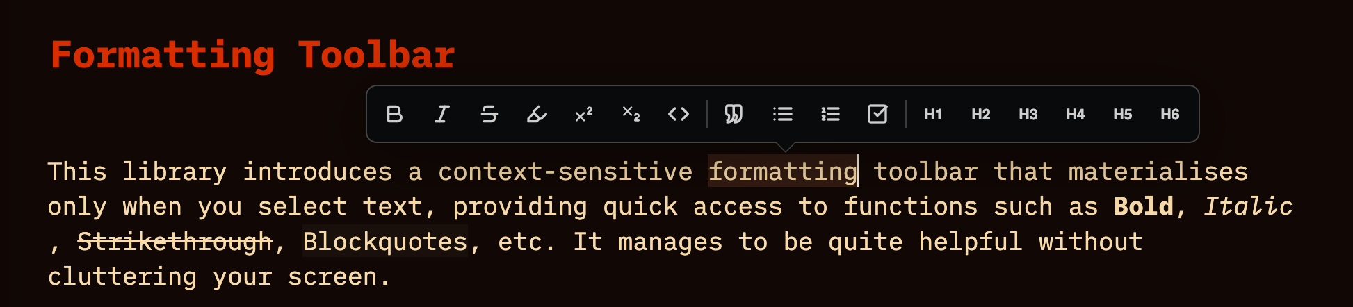 I am pleased to introduce the Formatting Toolbar, a context-sensitive interface designed to streamline your markdown workflow. This library remains hidden until you select text, at which point it appears near your cursor to provide immediate access to common styling and structural tools. It is built to be theme-aware, supporting both light and dark modes.