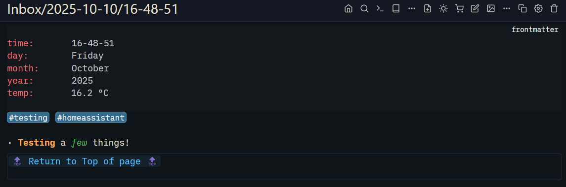 Quick one on something I have been working on. I have set up my quick note template to pull in weather info from my local home Assistant instance (but this could theoretically be used for all sorts of things).
