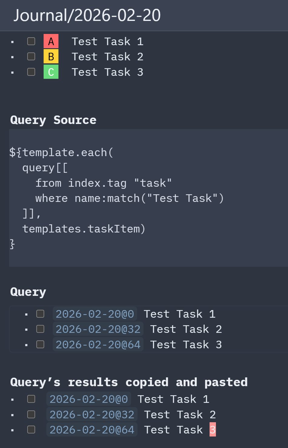 So a query can be transformed/converted to markdown using the “copy” button on the top-right corner and pasting it into the page. This will be copied into the markdown, and not linked to the original tasks.