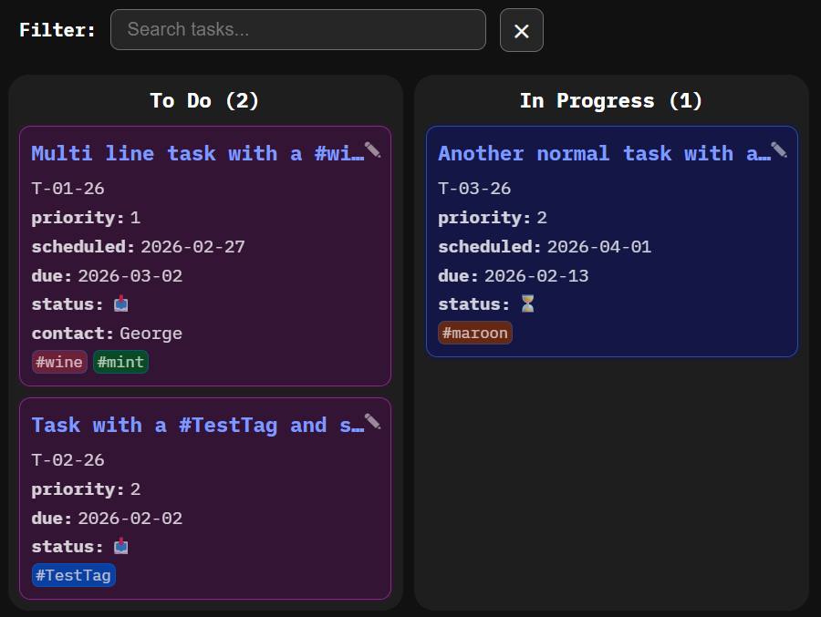 One thing I noticed is when you are toggling something as complete in the task list, the [completed: "«DATETIME»"] attribute is added/removed, whereas if I mark something complete in the kanban board, only the checkbox is toggled, but the completed attribute is not added/removed.