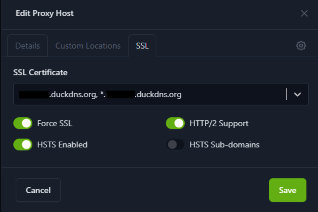 *.yourawesomedomain.duckdns.org - add your credential / token from duckdns (or your own domain manager) to