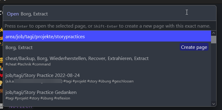 Here I searched for Borg, Extract and pages like area/job/tagi/projekte/storypractices are above the page I was actually looking for: Backup, Borg, Widerherstellen, Recover, Extrahieren, Extract. If I would search for borg extract the searched page is in the list even on the position 15 (!) and many pages containing Story Practice are above it.