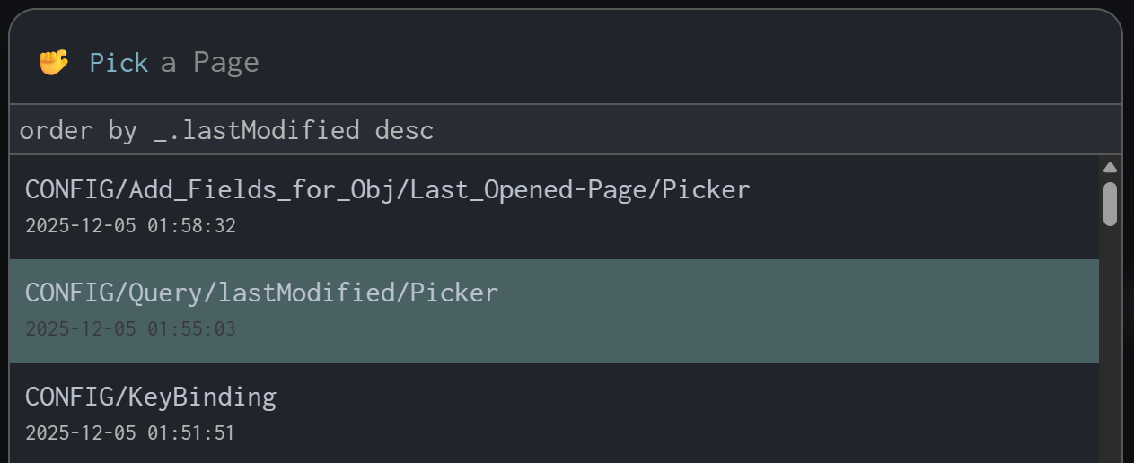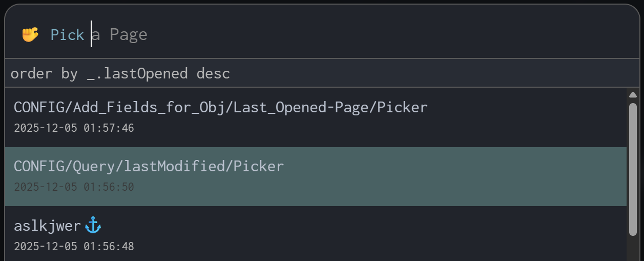 Since the Page Picker’s ordering rule is neither order by _.lastOpened desc, nor order by _.modified desc, nor order by _.lastClick desc mentioned in Click History - #12 by ChenZhu-Xie, I created these auxiliary pickers to help streamline buddie’s workflow.