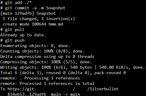 docker exec $CONTAINER sh -c "cd $REPO_PATH && git commit -a -m 'Auto Snapshot $(date)' && git pull && git push"