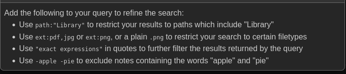 The important part here is, that you always have to add some text to search for, so you can’t just get all files under a specific path, or all files with a specific extension. This is a restriction by the minisearch api, which has <insert long github comment> reasons. I could work around that, but it introduces some questions like “What would the sort order be?” and omnisearch doesn’t do it. If you really only want all files e.g. from a specific extension you could do ext:pdf pdf.