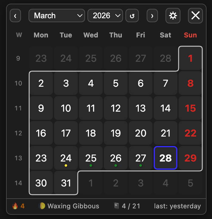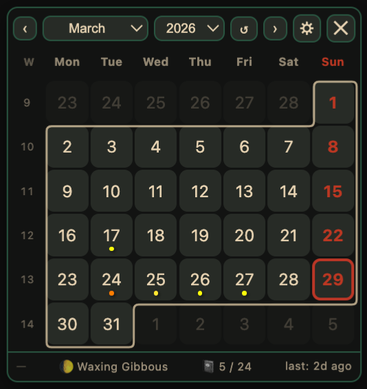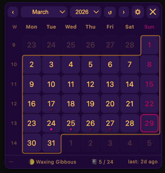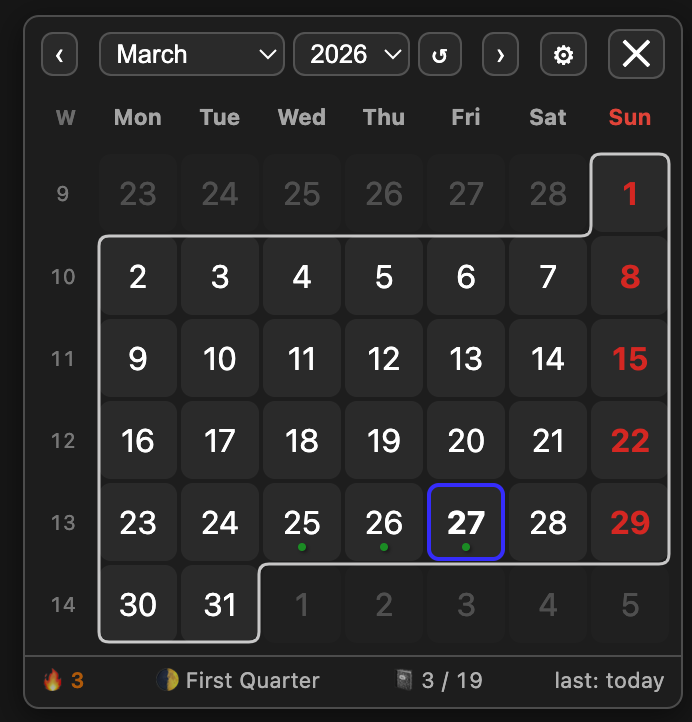 I already have a dedicated button for opening today's note, which uses the template already. But if, say, midnight just passed and I want to write a note in yesterday's journal page still, I currently don't have a great way to get that page to exist with the template in place. I would love for the floating calendar to provide a way for me to just click yesterday's date and get that page, setup correctly for yesterday's date. Both date.today() and the creation timestamp would be inaccurate in that case though.