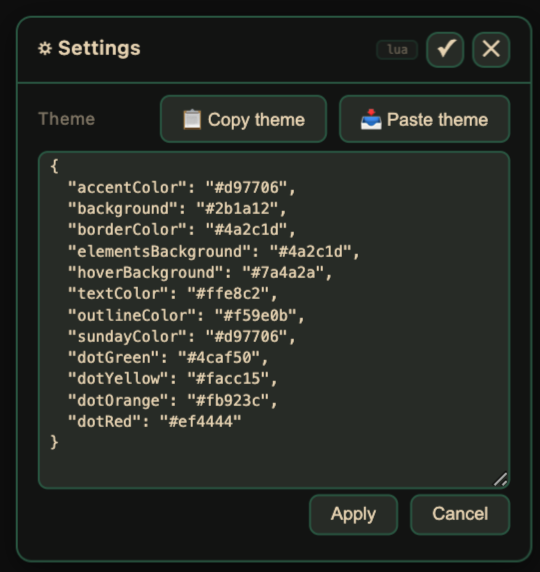 You can now set up all the customisation parameters using the new GUI settings page, as an alternative to the space-lua block with the config.set