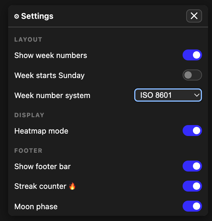 If you already set some parameters using the config.set space-lua function, these values will be locked & hidden in the settings page, to unlock, enable them, you must remove the space-lua block with config.set for FloatingJournalCalendar