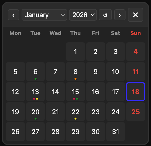 Manual “Today & Refresh”: The old “Today” button is repurposed now to act as a manual Refresh button too. Clicking it resets your view to the current date and instantly triggers a fresh scan of your space to update the activity dots, perfect for when you’ve just added a new entry.