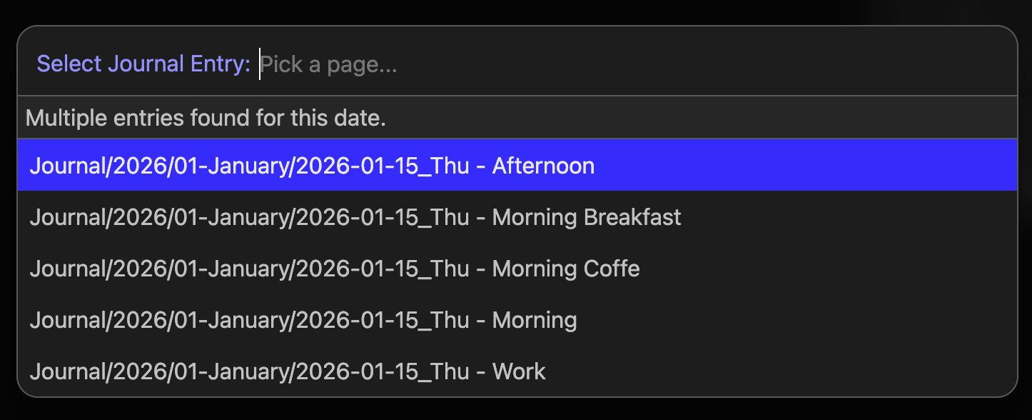 Wildcard Matching: The calendar now fully supports wildcard suffixes. It doesn’t just look for a 1:1 filename match; it scans for any page starting with your journal pattern. This means multiple entries for a single day, e.g.:
