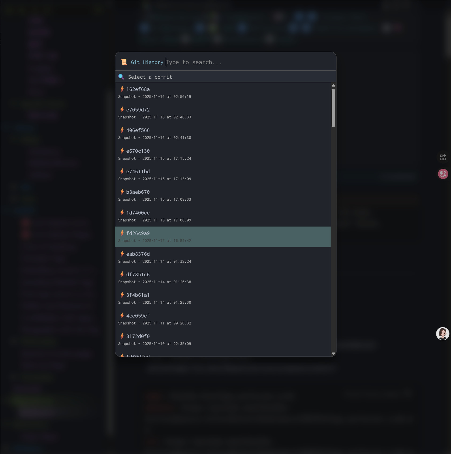 local selected = editor.filterBox("📜 Git History", history, "🔍 Select a commit", "Type to search...")