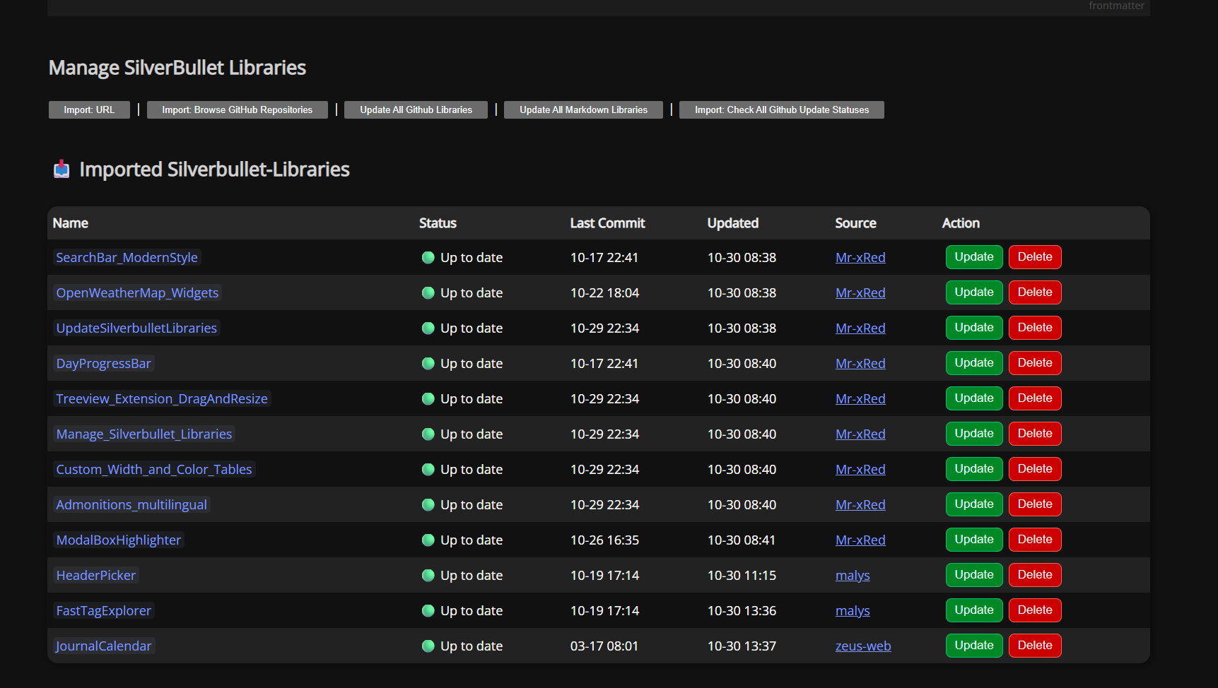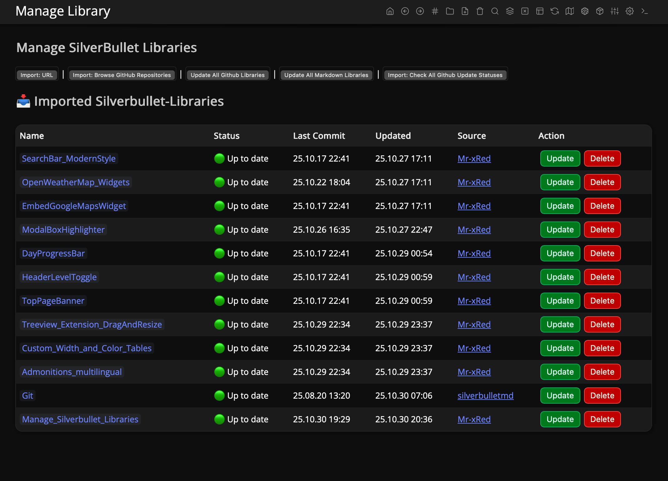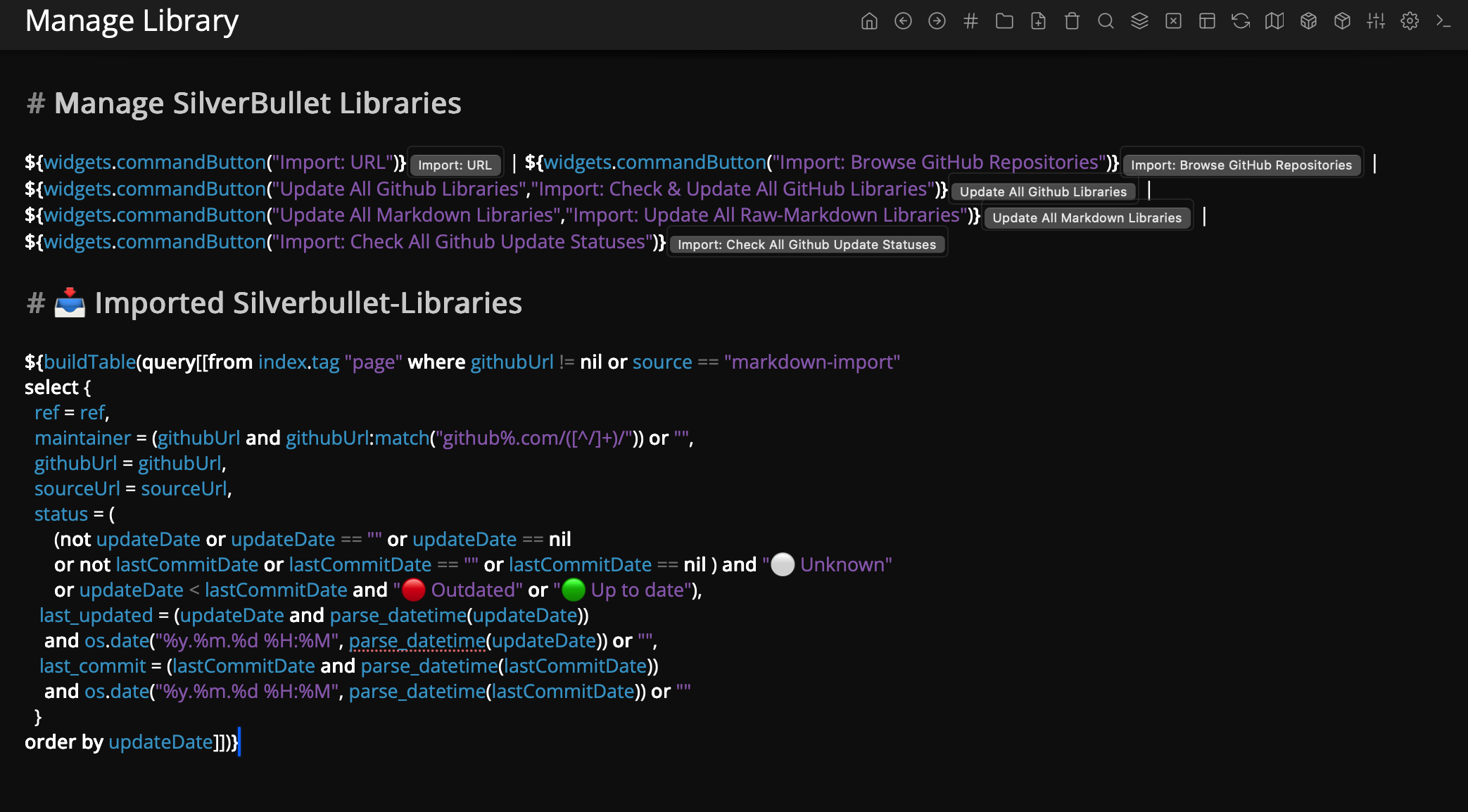 ${widgets.commandButton("Import: URL")} | ${widgets.commandButton("Import: Browse GitHub Repositories")} | ${widgets.commandButton("Update All Github Libraries","Import: Check & Update All GitHub Libraries")} | ${widgets.commandButton("Update All Markdown Libraries","Import: Update All Raw-Markdown Libraries")} | ${widgets.commandButton("Import: Check All Github Update Statuses")}