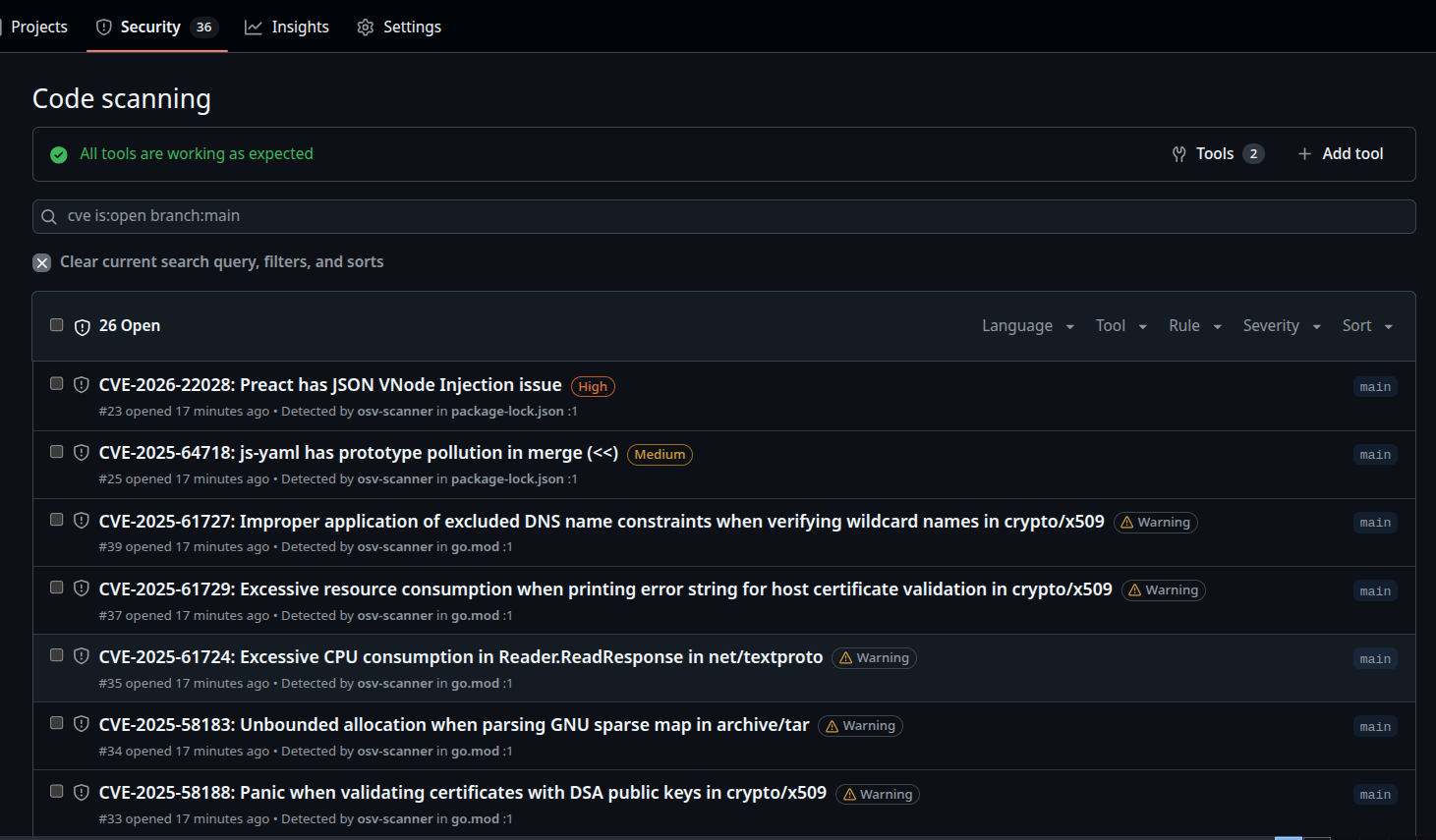 I would recommend to add a scanner to the workflows in the main repo. GitHub - google/osv-scanner-action would be an excellent choice, it uses osv.dev database, composed by multiple trusted data sources Data sources | OSV and supports various âecosystemsâ