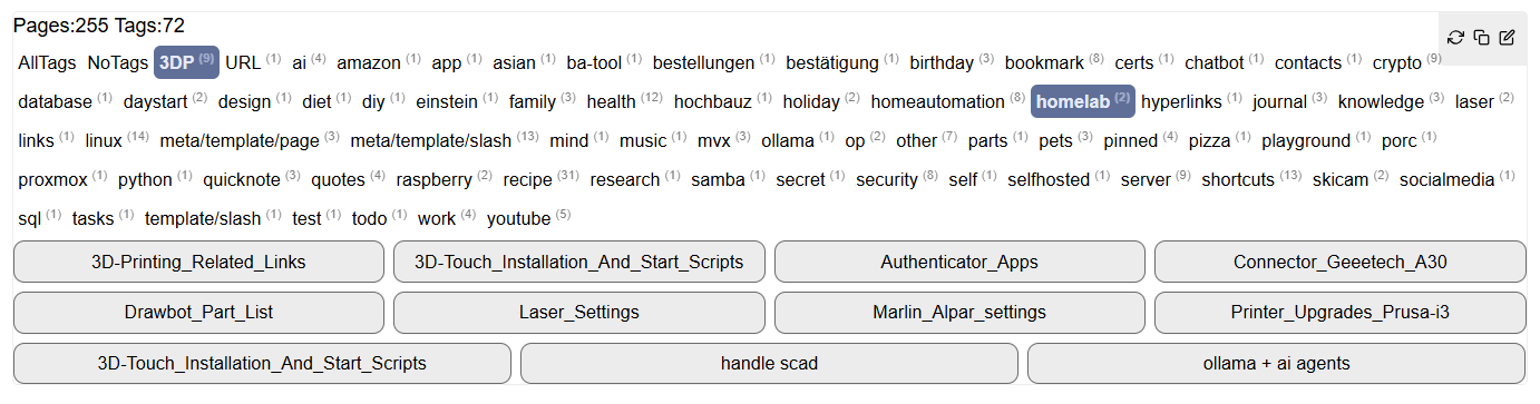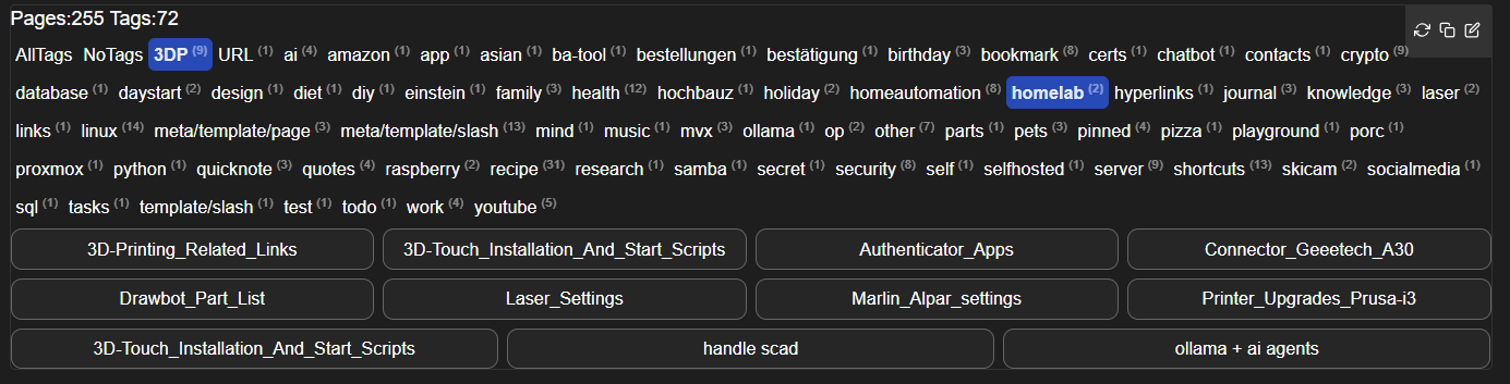 Ok, so trigger warning: I know this is a grubby hack—yes, it’s JavaScript embedded directly in an onclick inside a Lua script . This should/will definitely be refactored into a proper plugin.That said, here’s a first-pass proof of concept: a super-speedy tag-based page filter. I wanted to see if I could quickly reuse some logic from another project. It works very well.