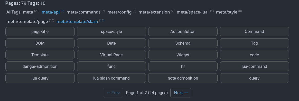Thank you @anthillsocial, I really like the idea and think something like this should be built-in to make it easier to filter pages by tag(s). With the help of Claude I have extended the widget a little bit. Since my space has been growing quite a bit I added pagination to the list of pages at the bottom (might need something similar for the list of tags, but I haven’t gotten there yet
