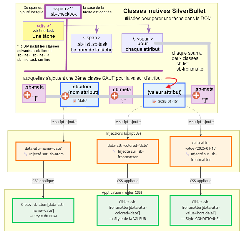When generating the html code (backend of md pages) by Silvebullet, a span is added to the description of the attributes it encapsulates.