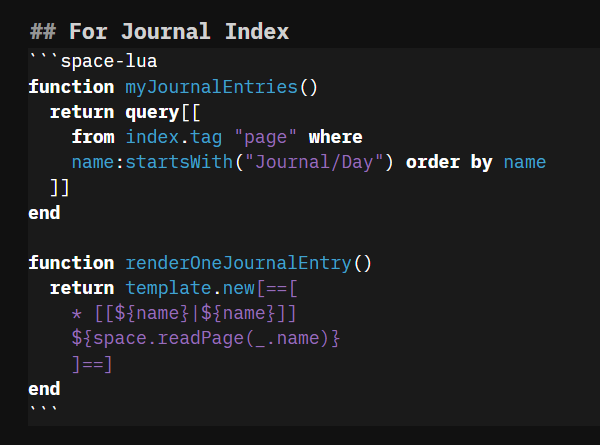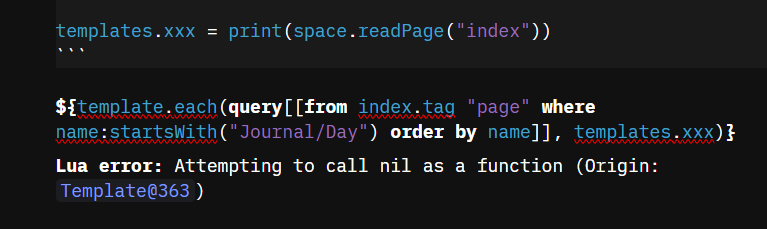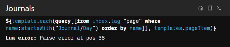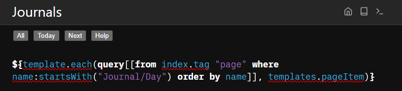 ${template.each(query[[from index.tag “page” where name:startsWith(“Journal/Day”) order by name]], templates.pageItem)}