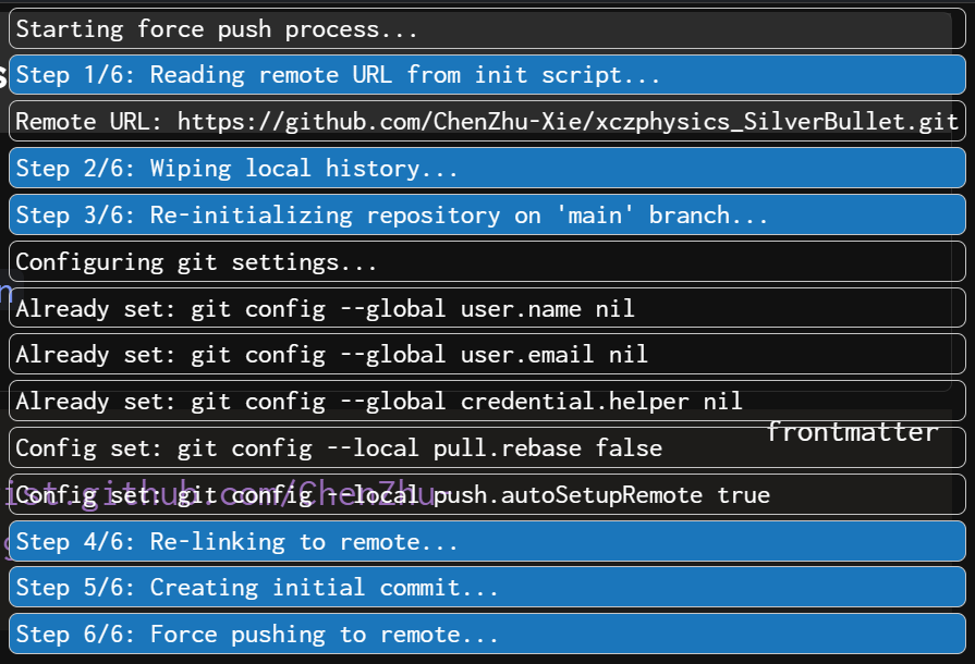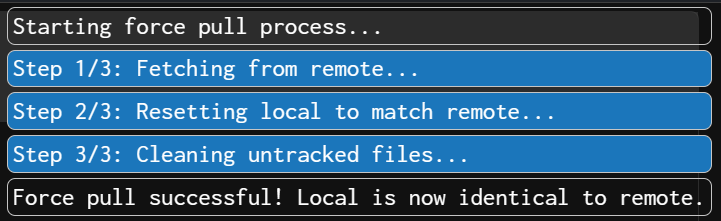 Compared with the official version, my implementation adds two commands: one for force-pushing to the origin as the initial commit, and another for force-pulling from the remote back to the local repository.