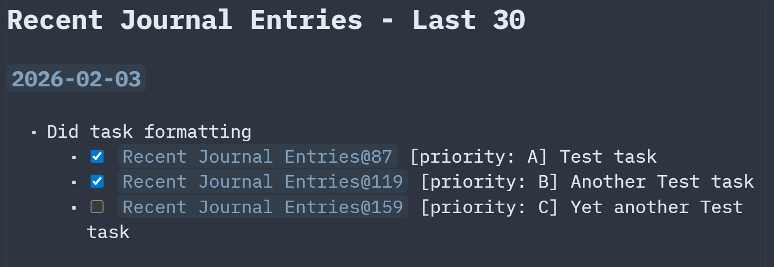 Sharing a “Recent Journal Entries” feature to display the latest 30 journal pages existing under Journal/<ISO date>.md (eg: Journal/2026-01-18.md). “Latest” here means sorted alphabetically by page name, which is an ISO date.